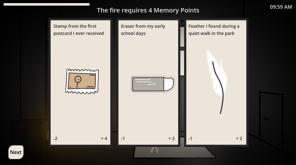 Trapped in a dark room, lit only by a fireplace and a sliver of daylight through the curtains, you must keep the fire alive — day after day — by burning pieces of your past.